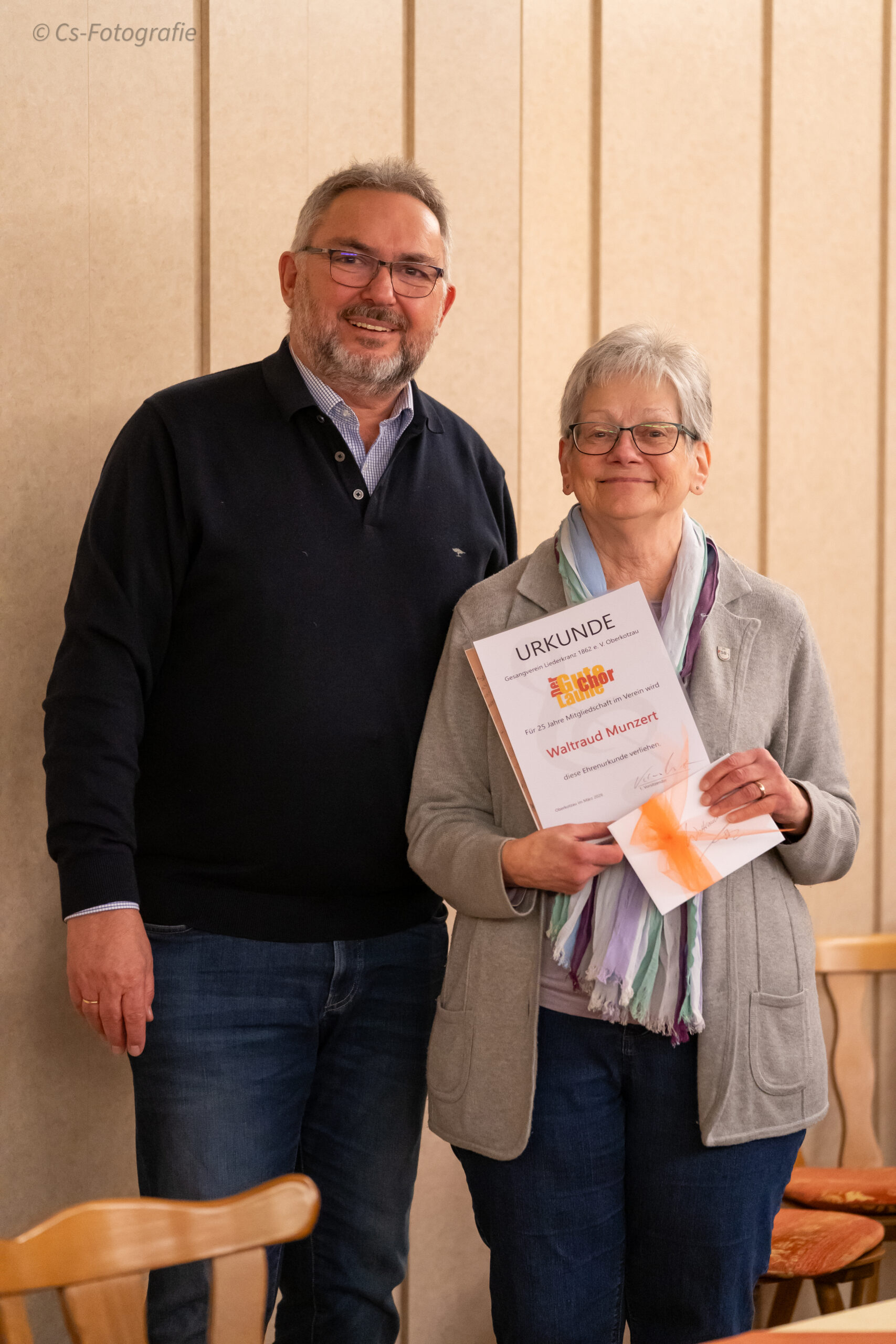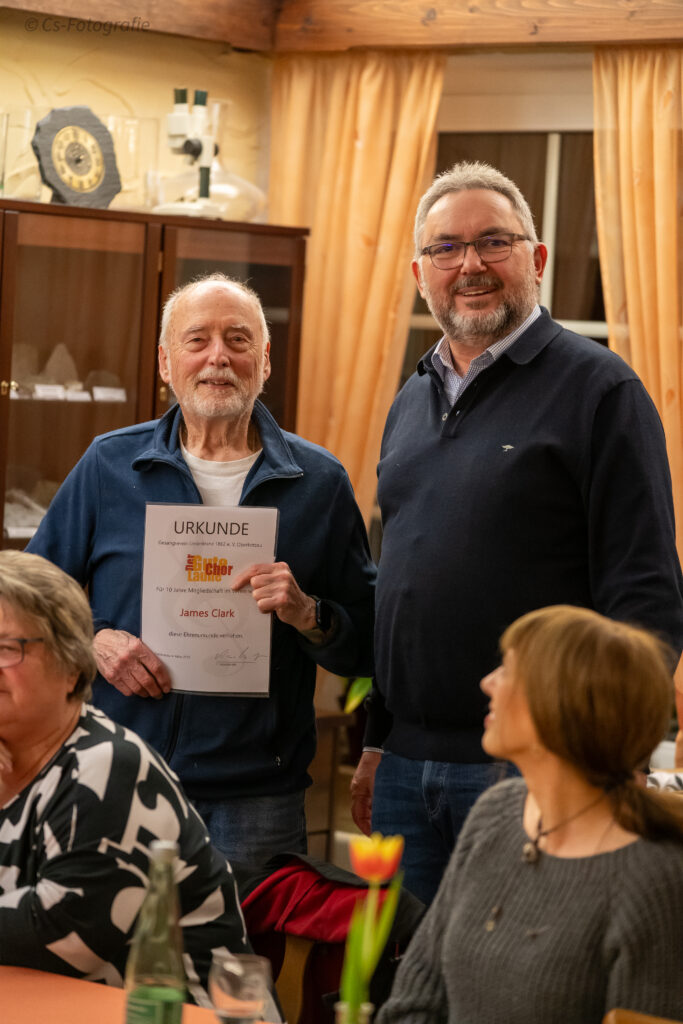 Für 25 Jahre aktives Singen im Chor wurde die stellvertretende Vorsitzende Waltraud Munzert geehrt, ebenso wie James Clark für 10 Jahre. Weiterhin wurde der ehemalige Chorleiter Jürgen Ocker für 25 Jahre Mitgliedschaft und Bernd Müller für 70 Jahre geehrt.